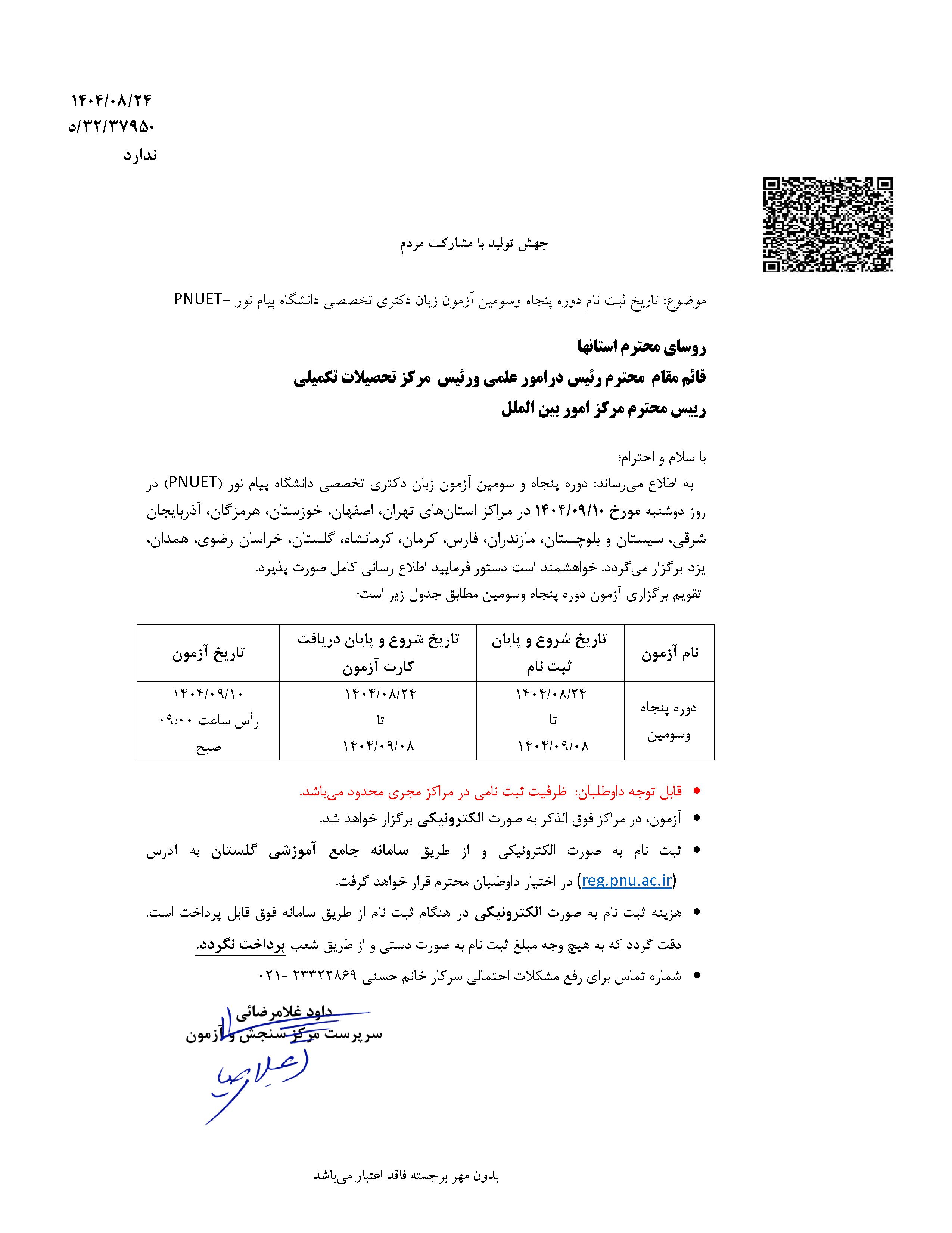 تاریخ ثبت نام پنجاه وسومین دوره آزمون زبان دکتری تخصصی دانشگاه پیام نور -PNUET