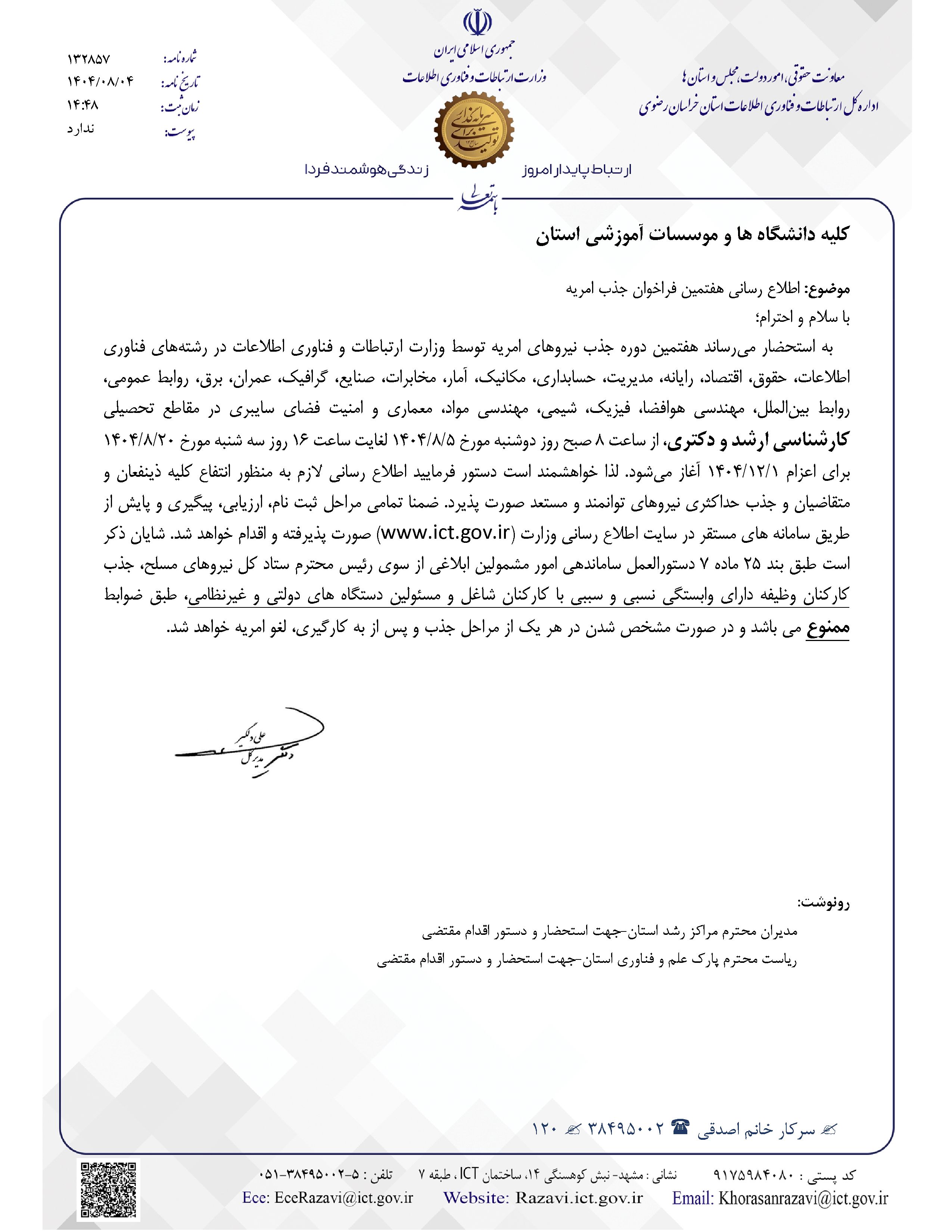 اطلاع رسانی هفتمین فراخوان جذب امریه وزارت ارتباطات