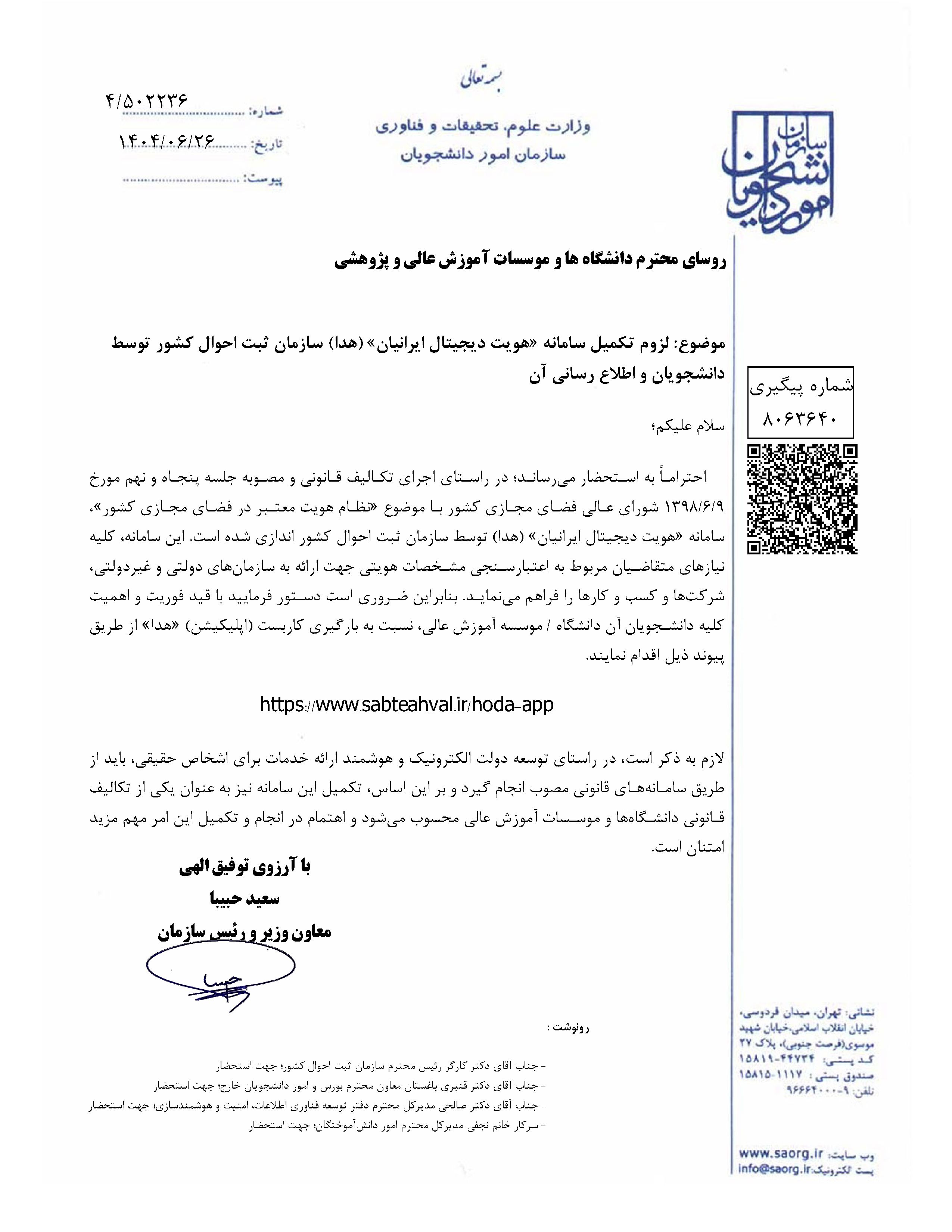 لزوم تکمیل سامانه «هویت دیجیتال ایرانیان» (هدا) سازمان ثبت احوال کشور توسط دانشجویان