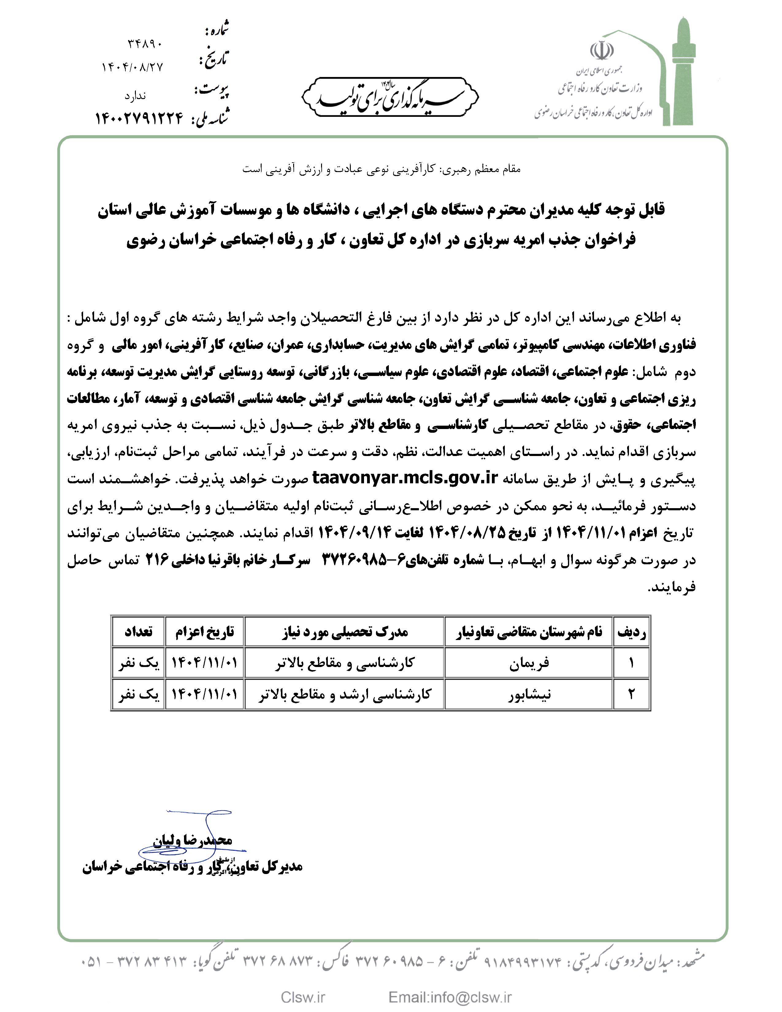 فراخوان جذب امریه سربازی در اداره کل تعاون، کار و رفاه اجتماعی خراسان رضوی