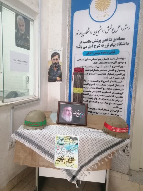 به گزارش روابط عمومی دانشگاه ، به مناسبت هفته دفاع مقدس درب ورودی ساختمان آموزشی و تحصیلات تکمیلی دانشگاه با تصاویری از شهدای 8 سال دفاع مقدس و لباس و کلاه رزمندگان اسلام به صورت نمادین صحنه آرایی گردید . و نیز دیوارهای ساختمان فرهنگی با عکس تعدادی از شهیدان دفاع مقدس مزین گردید.